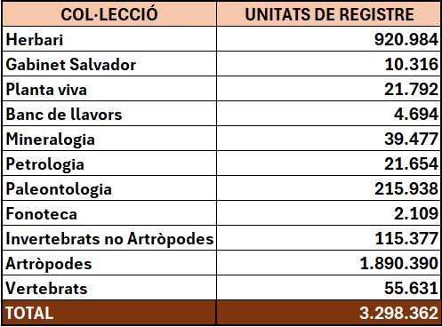 Les col·leccions del Museu comprenen més de quatre milions d’espècimens. Inclouen plantes, líquens, fongs, animals, sons, fòssils, minerals i roques recol·lectats i conservats durant més de tres segles gràcies a l’esforç de naturalistes i col·leccionistes, institucions i particulars, i al treball constant dels científics per comprendre millor la realitat biològica i la història geològica. Tenen una especial rellevància científica i són d’ús obligat per a la recerca taxonòmica i sistemàtica, són col·leccions de referència. Agrupen una alta diversitat d’espècies d’àmbit català i internacional i contenen nombrosos exemplars tipus, aquells que han servit per descriure nous tàxons. Les grans obres de consulta sobre la flora, la fauna i la geologia catalanes estan basades fonamentalment en els materials conservats en aquestes col·leccions.